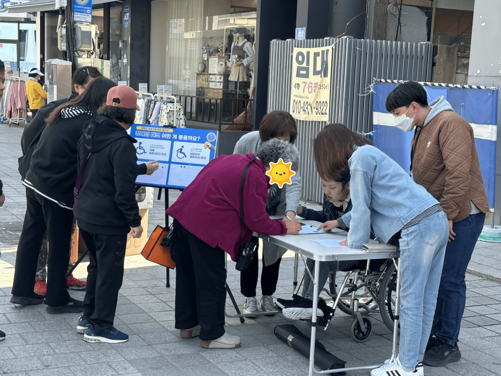 참여자들은 열심히 연습한 만큼 지나가는 시민들에게 장애인 마크에 대해 설명하고 동참서에 서명도 받았습니다.